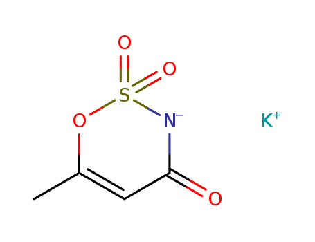 Acesulfame-K, the potassium salt of acesulfame, is a sweetener that resembles saccharin in structure and taste profile. 5,6-Dimethyl-1,2,3-oxathiazine-4(3H)-one 2,2-dioxide, the first of many sweet compounds belonging to the dihydrooxathiazinone dioxide class, was discovered accidentally in 1967. From these many sweet compounds, acesulfame was chosen for commercialization. To improve water solubility, the potassium salt was made. Acesulfame-K (Sunett) was approved for dry product use in the United States in 1988 and in Canada in October, 1994. In 2003, acesulfame-K was approved as a general purposes sweetener by the FDA. |